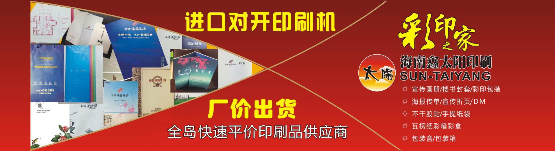 海南鑫太陽印刷業(yè)有限公司成立于2002年,主要從事生產海報畫冊、傳單簡介、精品包裝、掛歷臺歷、不干膠貼、手提紙袋、瓦楞紙包裝箱和彩箱紙盒等,公司有日本、德國等對開及四開高速彩色印刷機、自動膠裝機、自動鎖線機、自動復膜機等先進的自動化設備,業(yè)務涉及商業(yè)、地產、水產、食品、農林、藥品、化工、航空等行業(yè)的彩印包裝及宣傳印刷品。我公司另外還設有紙箱包裝廠,可以更好地為客戶配套生產各種檔次級別的瓦楞紙箱彩盒、普通紙箱紙盒、精裝禮盒等大型產品包裝,產品范圍包括花炮箱、飲料箱、食品箱、魚箱、花箱等。